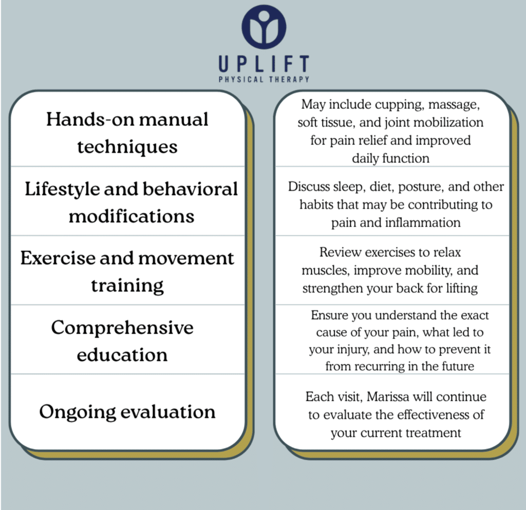 “I have been going to Uplift to help with my postpartum recovery for 8 weeks now and I could not recommend them enough. Marissa has been so great to work with and she has helped me have a speedy recovery with a great program. Everyone at the clinic is super friendly and helpful. I would recommend them to anyone looking for great PT!” – Marisol S.